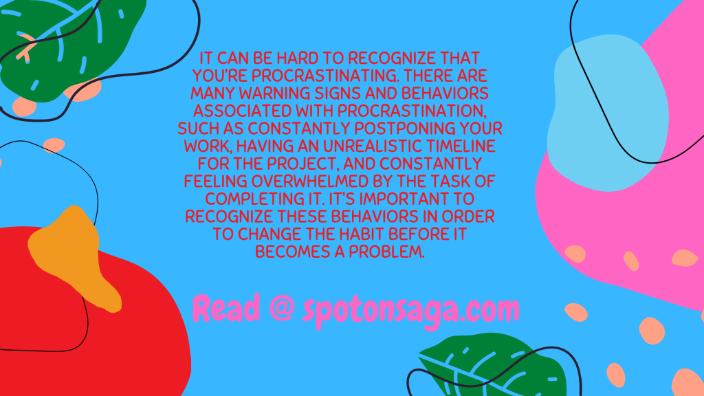 If you are aware of the warning signs that you’re procrastinating, then you can take steps to prevent it from happening. Some of these signs include losing your motivation, getting bored easily, and feeling unmotivated to do work. If these warning signs pop up often in your life, you should focus on the negative consequences that could happen if you continue to delay work or projects.
