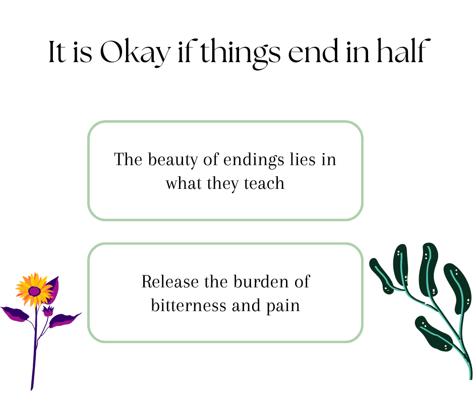 Life is full of journeys that don’t always reach their intended destination, and that’s perfectly okay. Recognizing when something has run its course can be liberating rather than disheartening. The beauty of things ending in half is the opportunity it presents for new beginnings and fresh perspectives. It allows us to let go of what no longer serves us, making room for new experiences and growth.